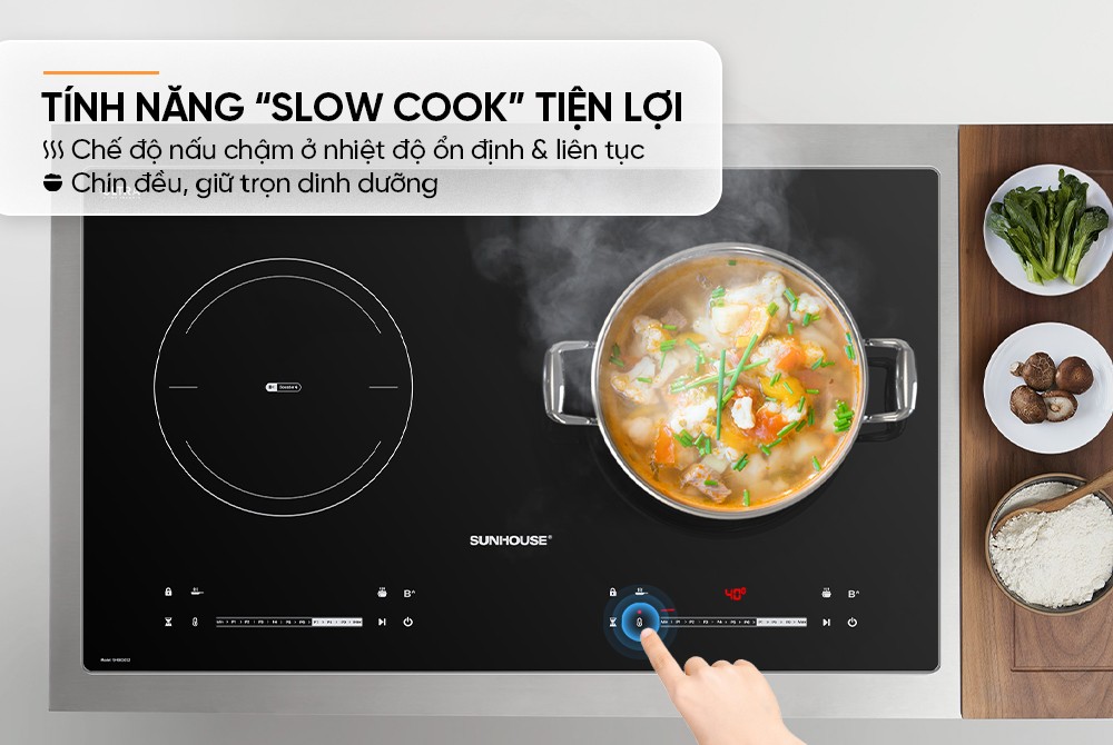 Nhằm nâng cao trải nghiệm sử dụng, bếp còn được tích hợp nhiều chế độ nấu nướng tiện lợi như chế độ chiên, xào, nấu nhanh… Đặc biệt, tính năng “SLOW COOK” – chế độ nấu chậm ở nhiệt độ thấp và ổn định trong suốt quá trình nấu, không bị đóng ngắt liên tục như các dòng bếp từ thông thường, giúp kiểm soát và đảm bảo nhiệt độ luôn chính xác. Điều này rất quan trọng đối với những món ăn cần nhiệt độ thấp như ninh, hầm, kho… và tạo hương vị mà không bị chín quá hoặc cháy, chính vì vậy món ăn giữ được hàm lượng chất dinh dưỡng cao, gần như là nguyên vẹn.