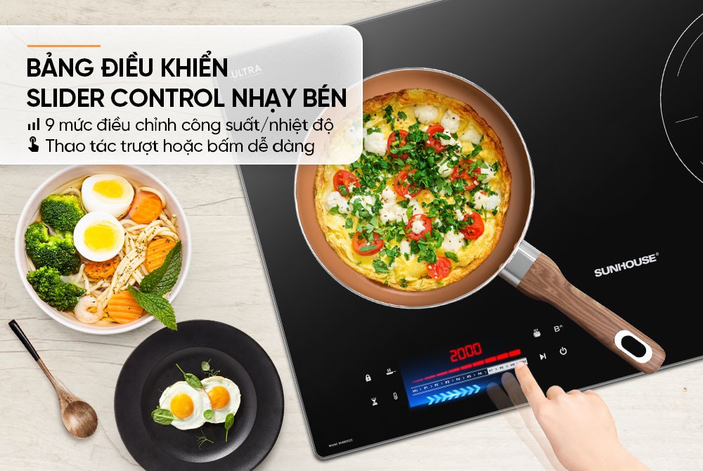 Bếp có 9 mức điều chỉnh nhiệt độ/công suất với 2 bảng điều khiển riêng biệt cho từng vùng nấu. Mặt điều khiển SLIDER CONTROL cảm ứng nhạy bén giúp điều chỉnh nhiệt độ và các chế độ nấu nhanh chóng và thuận tiện chỉ với 1 thao tác. Người dùng thực hiện thao tác trượt tay sang trái hoặc sang phải để tăng/giảm và điều chỉnh nhiệt độ, công suất hoặc thời gian. Điều khiển cảm ứng trượt dễ dàng sử dụng, phù hợp với mọi đối tượng.