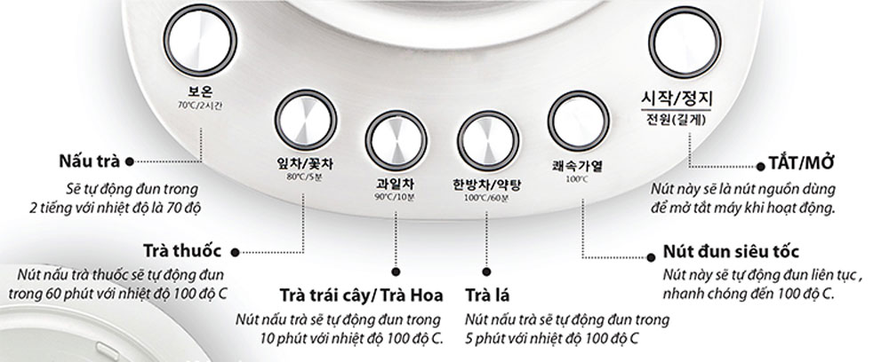 Ấm pha trà HUROM TM-B01 có nhiều chế độ hoạt động khác nhau để người dùng có thể pha trà, nấu thuốc, làm sữa chua, nấu cháo với thời gian cụ thể như sau: