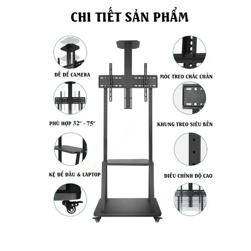 🧰 Thiết kế tiện lợi: Có kệ để laptop, camera hoặc thiết bị hội nghị ngay trên khung treo.