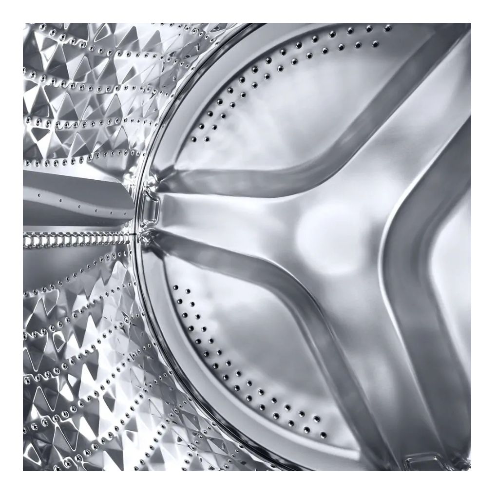 Lồng giặt của máy được làm bằng thép không gỉ có độ hoàn thiện cao. Bên cạnh đó, thép không gỉ được biết đến là vật liệu có khả năng kháng khuẩn và chống bám bẩn tốt lên sau khi sử dụng người dùng chỉ cần dùng khăn mềm lau khô là được. Hơn nữa thép không gỉ cũng có độ bền cao nên người dùng có thể an tâm sử dụng trong thời gian dài.