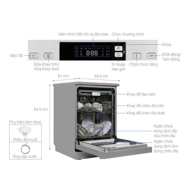 Chương trình rửa | Rửa nhanh, Rửa tiêu chuẩn (tiết kiệm), Rửa thường, Rửa đồ thủy tinh, Rửa chuyên sâu, Rửa tự động, Rửa 90 phút, Rửa ngâm |