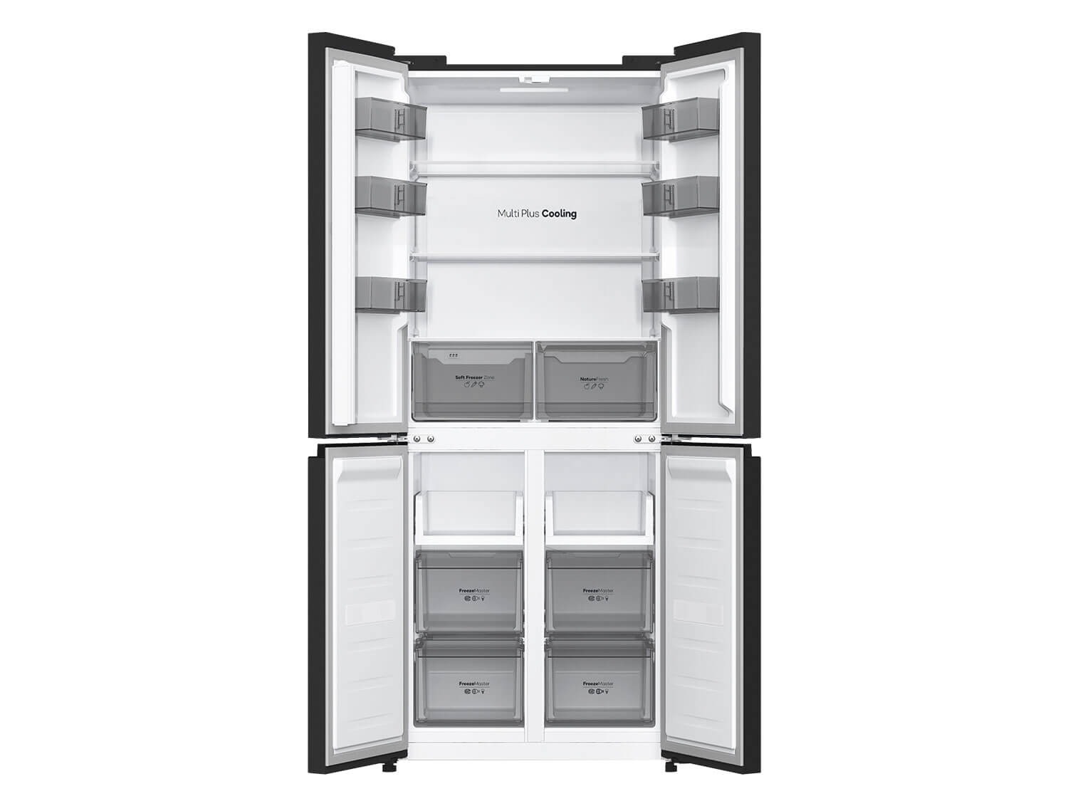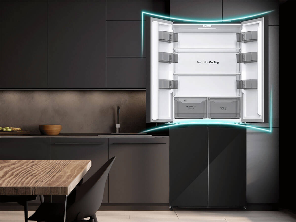 Thiết kế 4 cửa linh hoạt của tủ lạnh đem lại trải nghiệm góc rộng Panoramic View ngập tràn tươi ngon. Ngăn tủ trải dài không ngăn cách giúp dễ dàng lựa chọn thực phẩm, thoải mái đặt các khay, nồi đồ ăn lớn.